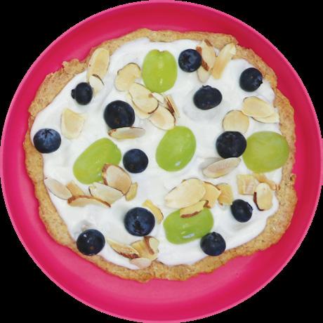 (139g)Tamaño de la porción Cantidad por porción porciones por receta Información Nutricional Calorías 330 Grasa Total % Valor Dairio* 22% 25% 0% 17g Grasa Saturada 5g Grasa Trans 0g 0mg 160mg 44g Fibra Dietética 3g Azúcares Totales 21g 0% 4% 10% 8% Incluye 0g Azúcares Añadidos 10g Vitamina D 0mcg Calcio 64mg Hierro 2mg *El % Valor Diario (VD) indica cuanto un nutriente en una porción contribuye a la dieta diaria. 2,000 calorías al día es la recomendación general 7% 16% 11% 22% Colesterol Sodio Carbohidrato Total Proteína Potasio 369mg Preparación: 1. Untar el yogur uniformemente sobre un lado del pan de pita. 2. Decorar con frutas y otros ingredientes que desee. 3. Cortar la pizza en rebanadas y servir. 20 Min | 4 Porciones Consejo: Para un toque diferente, sustituye el yogur con mantequilla de cacahuetes. Pizzas de Frutas