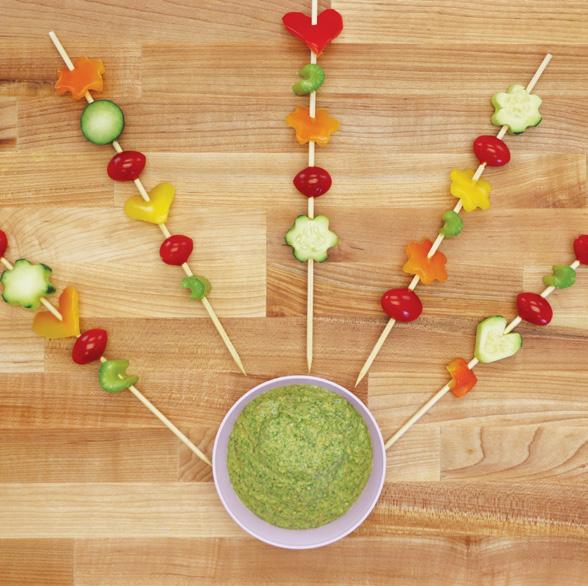 Preparación: 1. Pinchar con cuidado los vegetales en las palillos de madera para crear varitas coloridas de vegetales. (¡ Los palillos pueden ser afilados! Con la ayuda de un adulto, pinchar los vegetales con cuidado.) 2. Mientras tanto, añadir todos los ingredientes para la salsa a una licuadora para mezclar. 3. Untar las varitas de vegetales en la salsa.