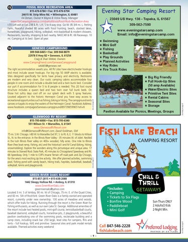 815-476-6784 • Fax: 815-476-6704 24615 W. Strip Mine Rd. • Wilmington, IL 60481 Ed Zeman, Owner • Wayne & Vickie Pavey, Manager www.GoCampingAmerica.com/parks/illinois/Fossil-Rock-Recreation-Area I-55 Left exit at Exit 238 & Rt.129, S to 4-way stop. Go W. (R) 3/4 mi. L. Petting Farm, Peaceful shaded 80 acres with fossil hunting, beach, stocked lakes, horseshoes, playground, hiking, volleyball, mini-basketball & modern showers. Restaurants, laundry, shopping & bait nearby. NASCAR & Rt. 66 Raceways. 10 mi. Camping at its best. Open all year.