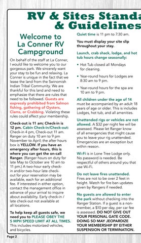 On behalf of the staff at La Conner, I would like to welcome you to our gorgeous park. We sincerely want your stay to be fun and relaxing. La Conner is unique in the fact that we lease the land from the Swinomish Indian Tribal Community. We are thankful for this land and need to emphasize that there are rules that need to be followed. Guests are expressly prohibited from Salmon fishing, gathering of Oysters, Clams, or Crabbing. Violating these rules could affect your membership.