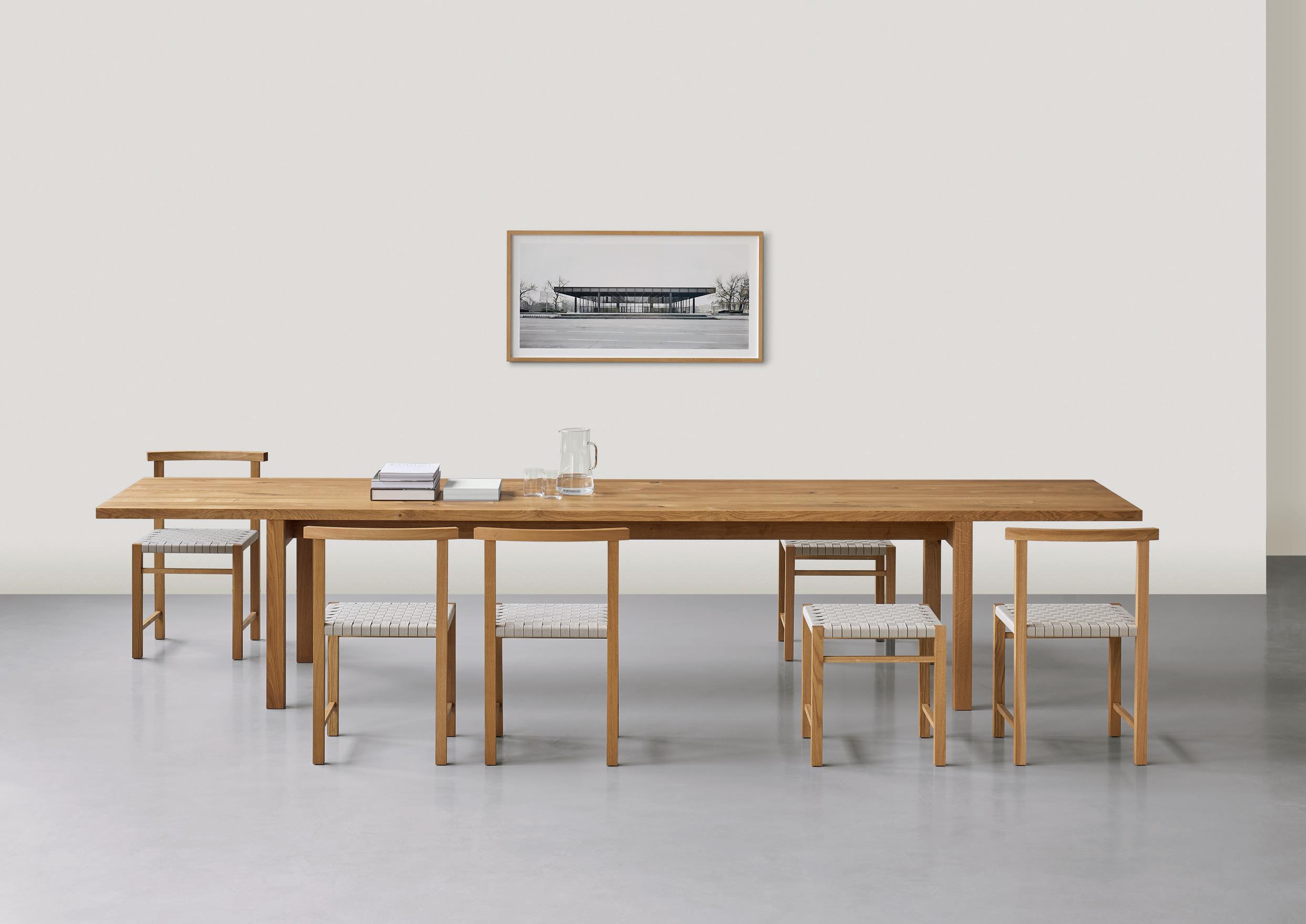 Der Tisch GALERIE wurde ursprünglich für das Café der Neuen Nationalgalerie entworfen. Das schlanke und langgestreckte Profil von GALERIE unterstreicht den markanten und reduzierten Charakter des ikonischen Gebäudes. GALERIE ist in den drei proportional angelegten Größen Small, Medium und Large erhältlich, wobei die Tischplatten jeweils mit einem kurzen oder langen Über-hang angeboten werden.
