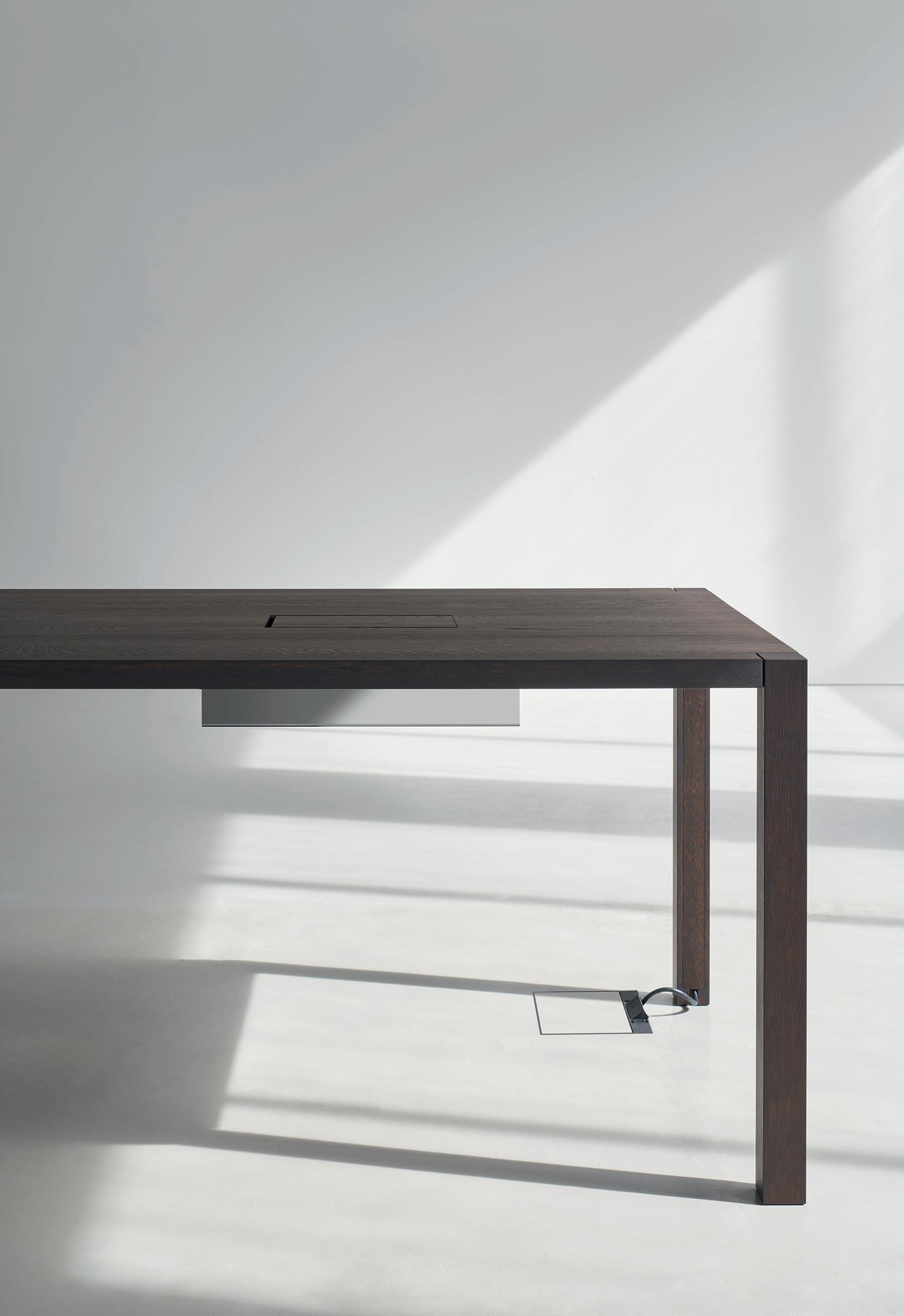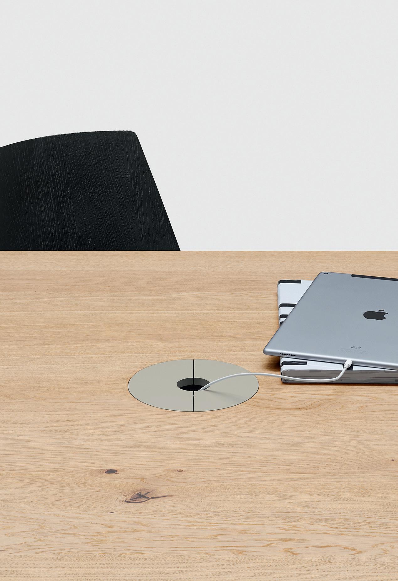 e15 tables and other e15 furniture can also be ordered with an integrated cable management solution. Adaptations regarding material, dimensions, form, colours as well as different finishes are also possible.