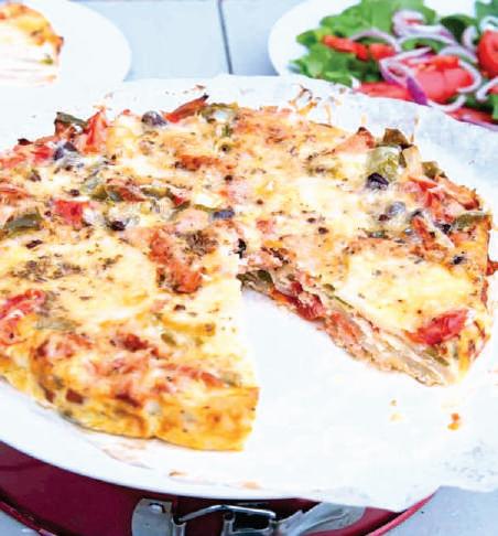 oreganum en paprika. Geur met sout en peper na smaak. Meng goed. Giet die eiermengsel bo-oor die mengsel in die koekpan. Kantel die pan sodat die eiermengsel egalig deur al die bestanddele versprei. Bak vir 30 minute in ‘n voorverhitte oond van 190ºC vr ongeveer 30 minute of totdat dit gestol het en goud van kleur is. Sny in skywe en bedien met vars roeketblare of 'n lekker mengelslaai. WENK: Jy kan brosgebraaide spek of boeliebief in die plek van die chorizo gebruik.