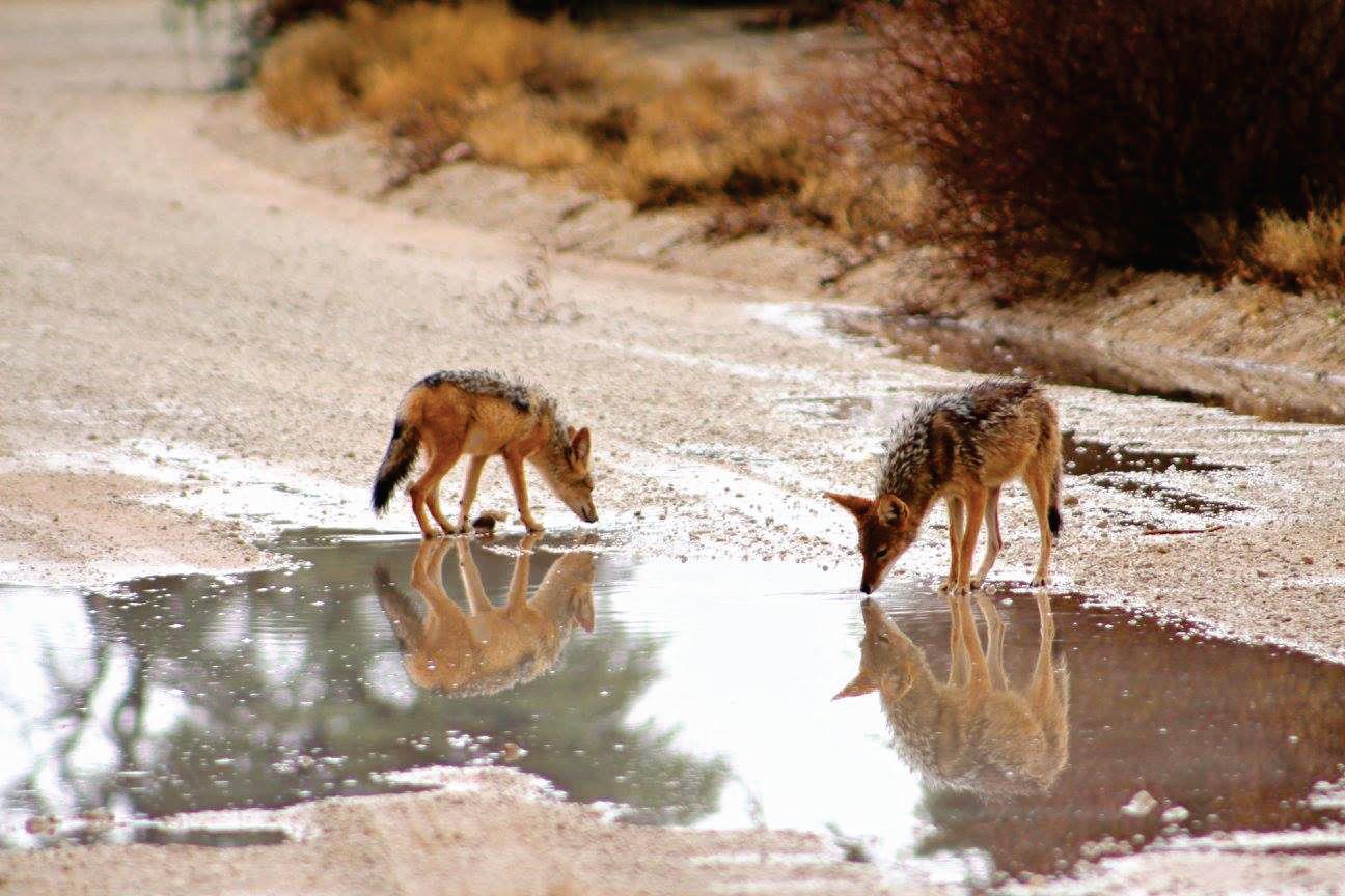 The KgalagadiTranfrontier Park never dissapoints, here are two Black-Backed Jakals enjoying some fresh rain water. Be sure to book at Kgalagadi Lodge for the ultimate experience.