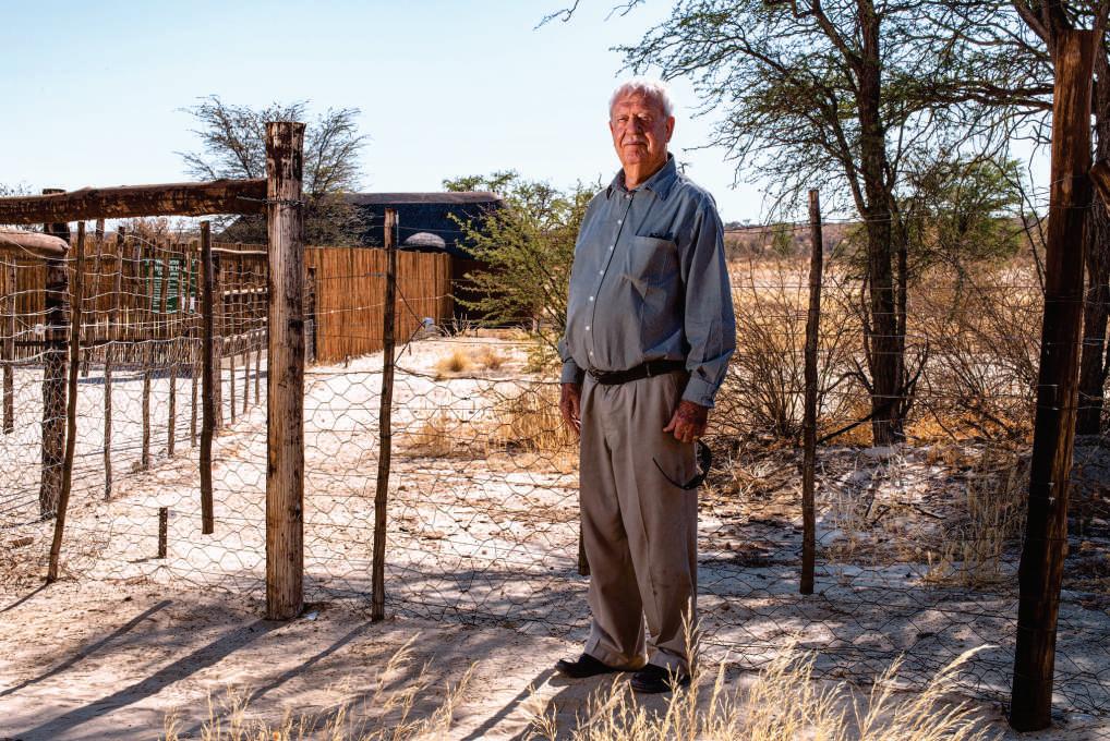Apicture that evokes memories and engenders respect. Elias and Doempie le Riche in front of the old gate pillars.At the back the administrative and reception building is visible. Nossob camp is part of the legacy of these two people, yet they are the first to honour and pay tribute to all who worked with him: Vetpiet Kruiper, Willem de Waal, Hendrik Bezuidenhout, Kotie Herholdt, the Van Wyks, Vilanders, Jagers, and countless others.