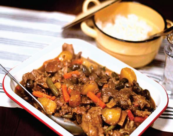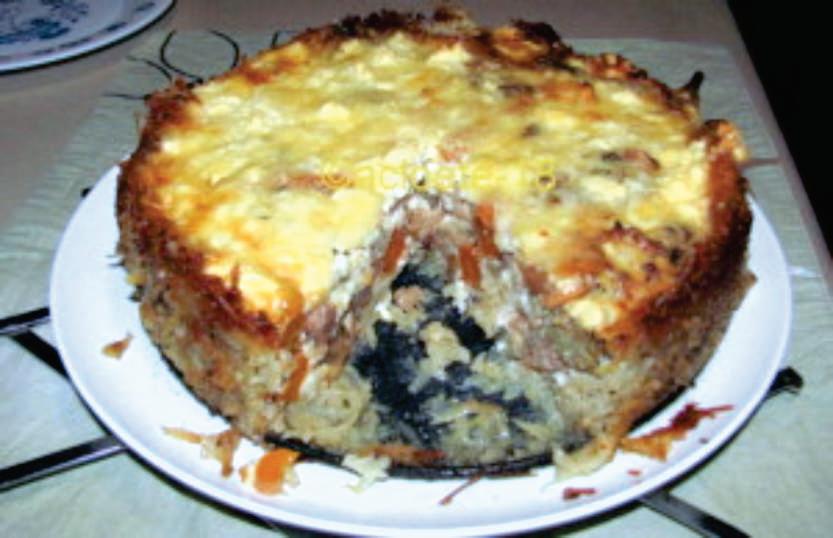 Haal die aartappelkors na ‘n uur uit die oond en rangskik die groente daarin. Giet die eiermengsel daaroor en strooi die orige kaas daaroor. Verlaag die oond temperatuur tot 180ºC en bak vir 30 minute. Laat vir 15 minute staan voor die bedien word.