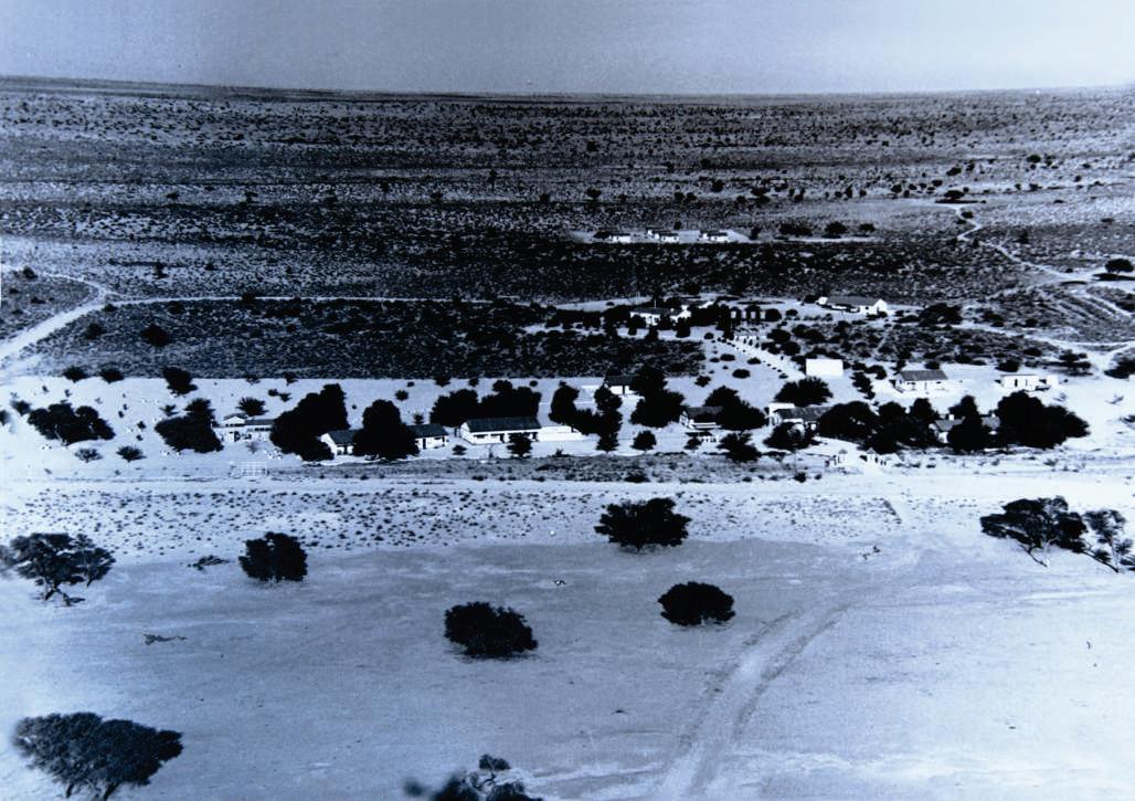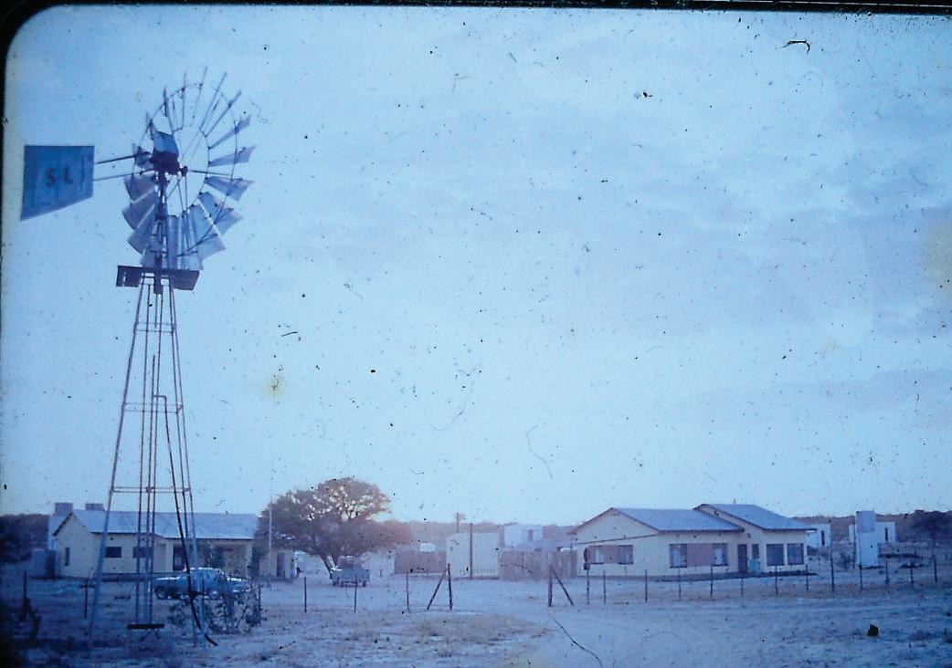 Nossob in the sixties. Note the Lekkerwater windpump and the abscence of the gate pillars. Behind the windpump is the administration and reception block, still performing the same function.To the right is Elias and Doempie’s first house.Today it serves as tourist accommodation. Note the camel thorn tree behind the bakkie. It is the same tree that offers shade to today’s tourists checking up on their WhatsApps, emails and Facebook status. I