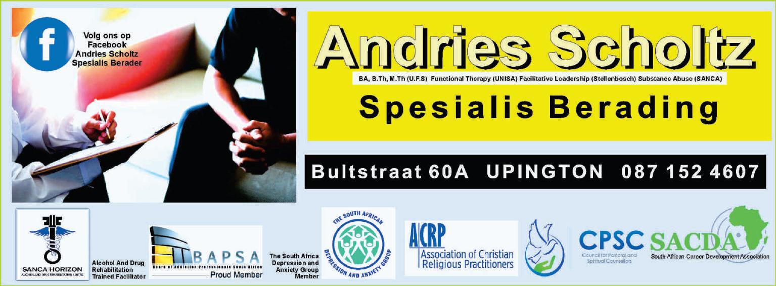 Bladsy 40 Electrical Wholsalers VEC 69 Schroder St, Upington 082 066 3156 NelsonMandelaRylaan,Upington.0543324767 *Dries0607337108 *Nick0823387070 Jesse0828669543 3ToekomStreet Upington Accredited Training Centre 0543321236 Good Better Best DiagnosticAudiograms Hearing aids Custom ear plugs done onsite LENMED KATHU Private Hospital 071 338 2814 info@holistichearing.co.za Wiedaad Bowers BScAudiology (UCT) PR 0956813 Holistic Hearing KATHU Life Is Better In Full Volume “ ” ProfessionalAudiologist AdvanceTechnology Affordable Prices Vrydag 7 April 2023