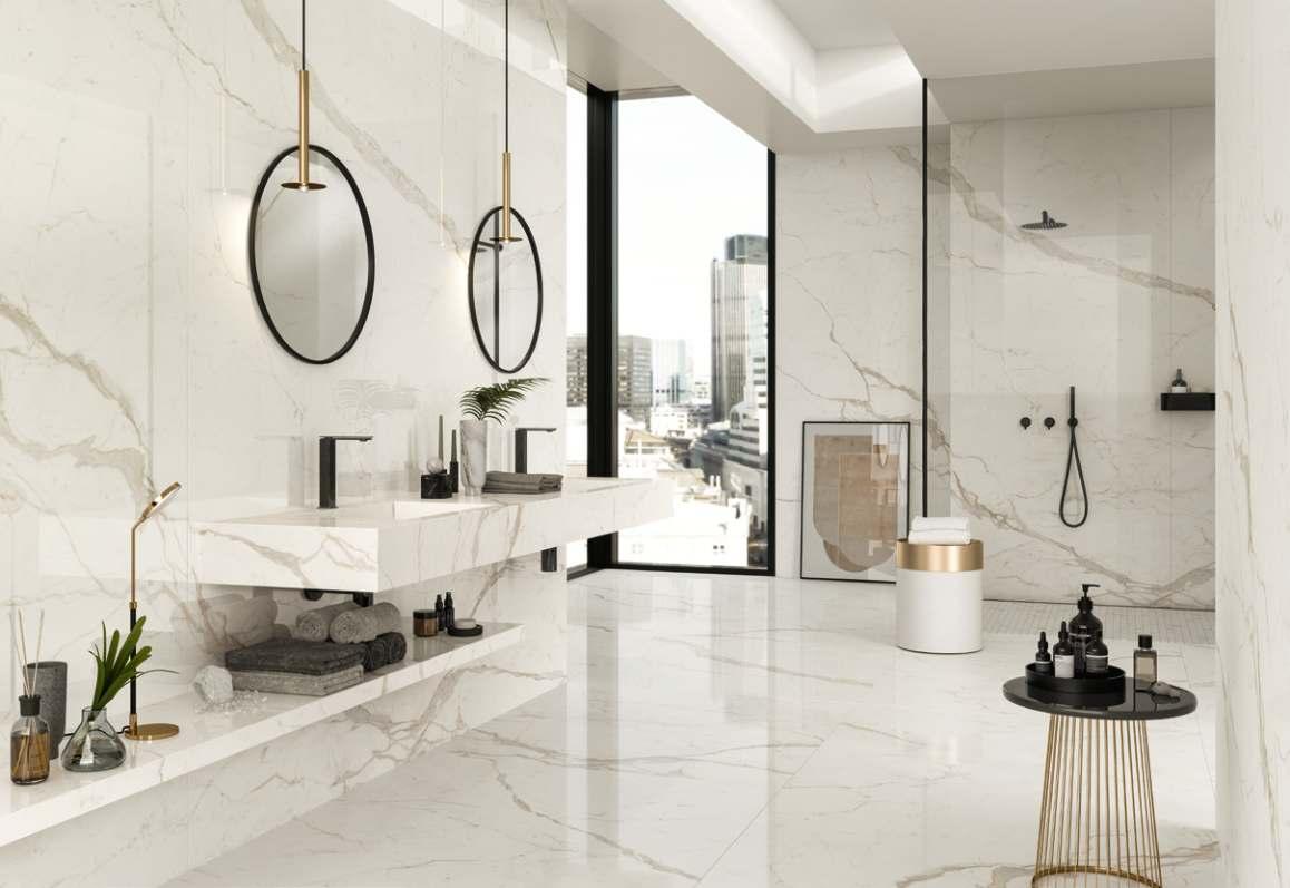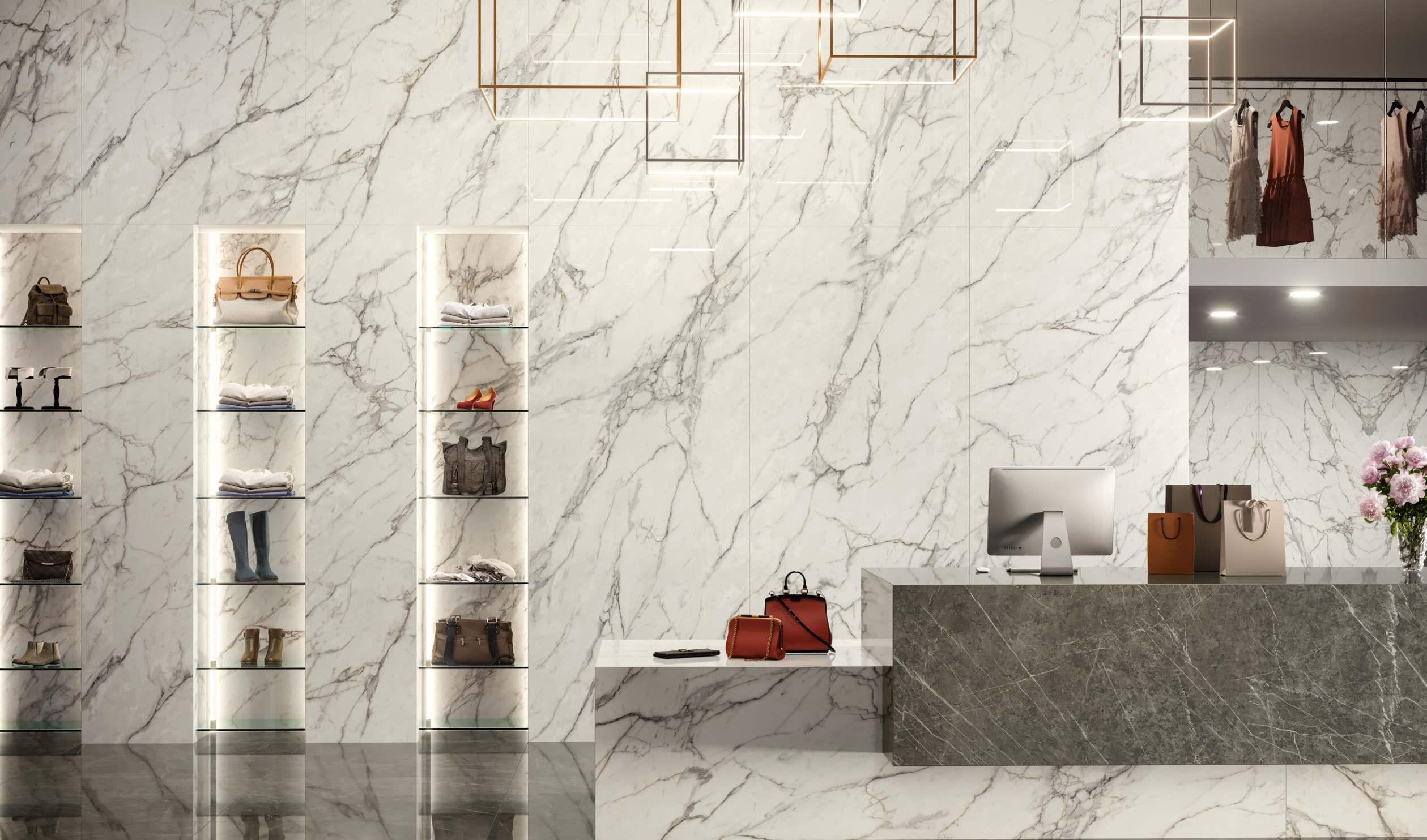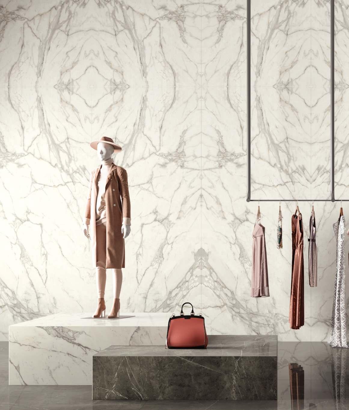 Calacatta Extra Endless is composed of four graphics with vein continuity, but are distributed randomly in the boxes, without the possibility of choosing between the available patterns. / Calacatta Extra Endless è composto da quattro grafiche con continuità di vena, ma all’interno delle casse queste sono distribuite in modo casuale, senza possibilità di scelta tra pattern disponibili. / Calacatta Extra Endless est composé de quatre graphismes avec les veinures en continuité, mais celles-ci sont distribuées en mode aléatoire à l’intérieur delle caisses, sans possibilité de choix entre les motifs disponibles. / Calacatta Extra Endless besteht aus vier Grafiken mit durchlaufender Äderung; diese sind jedoch in den Kisten nach dem Zufallsprinzip enthalten, ohne dass Sie zwischen den einzelnen Motiven wählen können. / Calacatta Extra Endles se compone de cuatro gráficos con continuidad de vetas, pero en el interior de las cajas están distribuídos de forma aleatoria, sin que se pueda elegir el patrón disponible. / Calacatta Extra Endless состоит