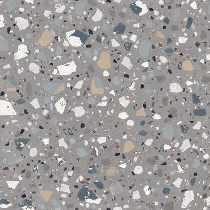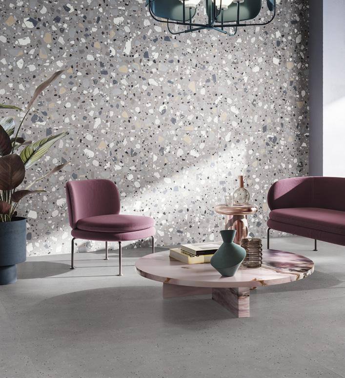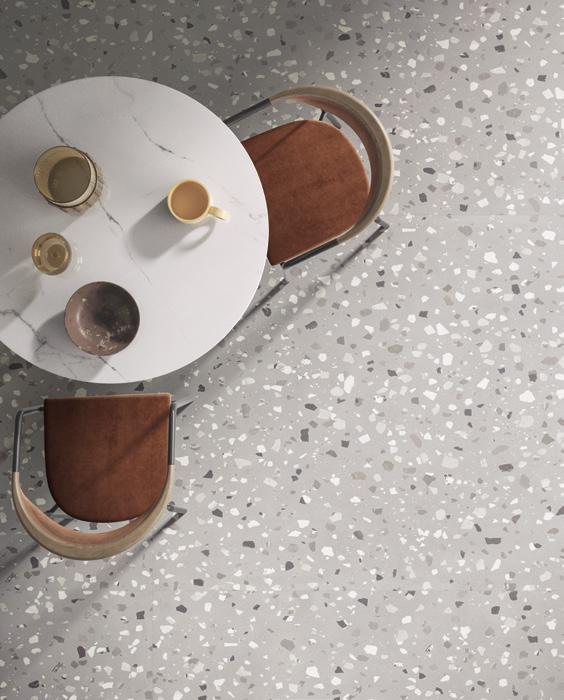 Reviving the timeless terrazzo pattern concrete with mosaic flakes: a balanced composition of design, colour and vitality.