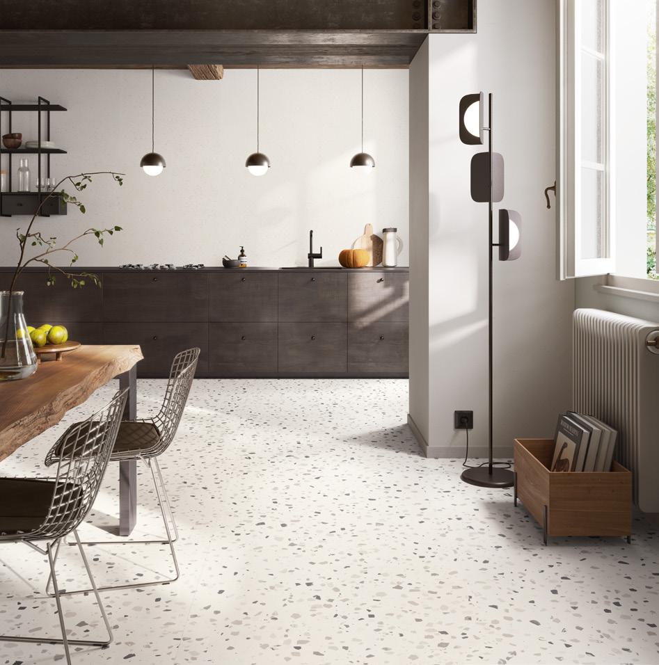 Fare rivivere l’intramontabile motivo a terrazzo in cemento con scaglie a mosaico: un componimento equilibrato di design, colore e vitalità.