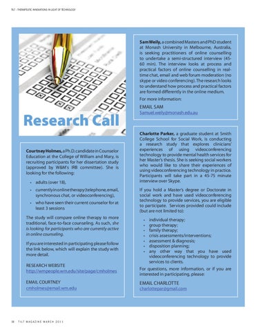 Research Call Courtney Holmes, a Ph.D. candidate in Counselor Education at the College of William and Mary, is recruiting participants for her dissertation study (approved by W&M's IRB committee). She is looking for the following: • adults (over 18), • currently in online therapy (telephone, email, synchronous chat, or videoconferencing), • who have seen their current counselor for at least 3 sessions The study will compare online therapy to more traditional, face-to-face counseling. As such, she is looking for participants who are currently active in online counseling. If you are interested in participating please follow the link below, which will explain the study with more detail. Research website http://wmpeople.wm.edu/site/page/cmholmes EMAIL COURTNEY cmholmes@email.wm.edu