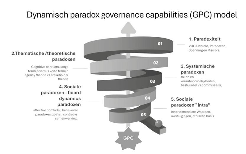 weergave van paradox governance capabilities: de verschillende paradoxen, de interactie tussen de verschillende paradoxen en het deep leverage point van mens en wereldbeelden. Dit dynamische model wordt verfijnd in vervolganalyses van de data.