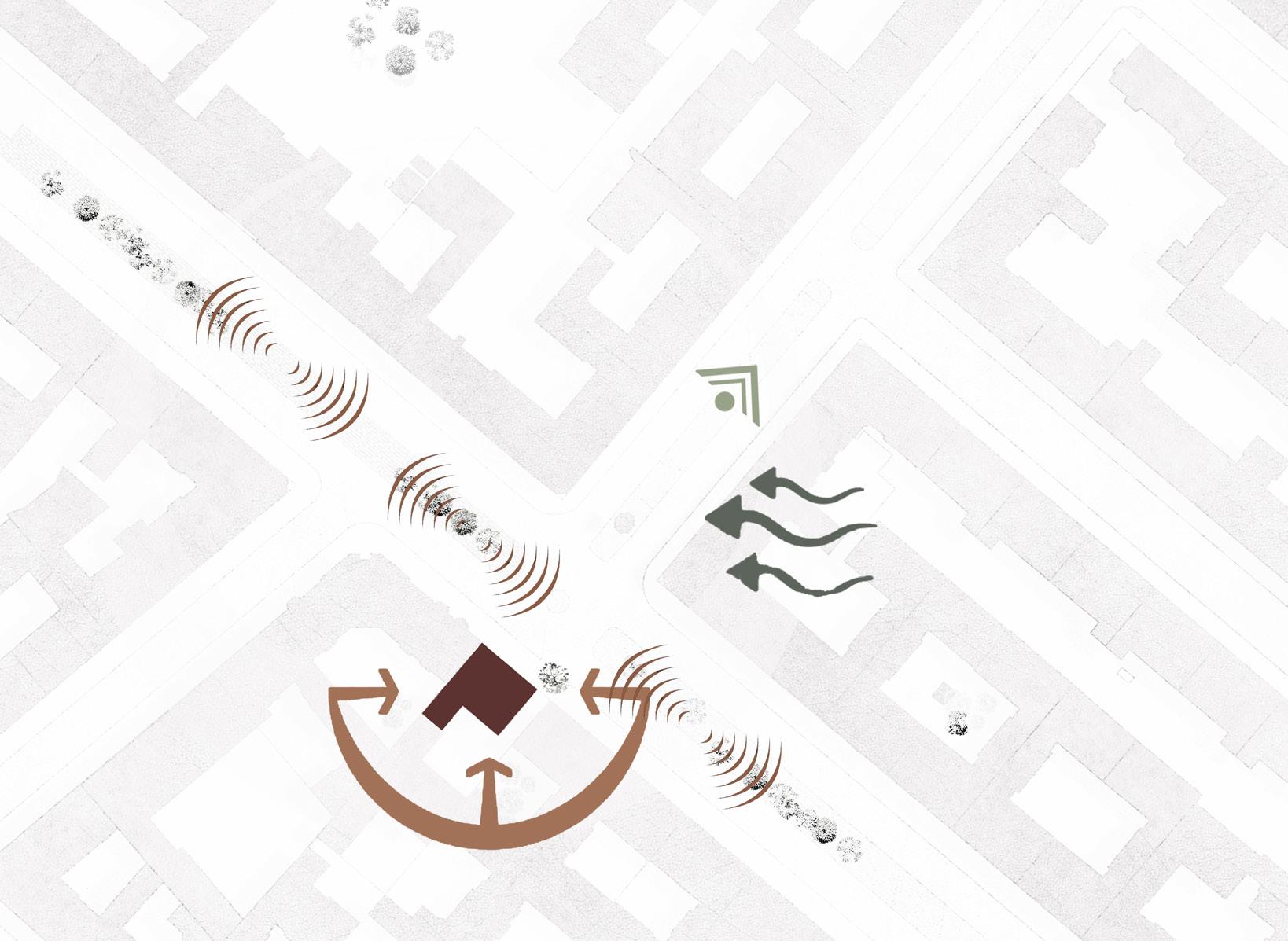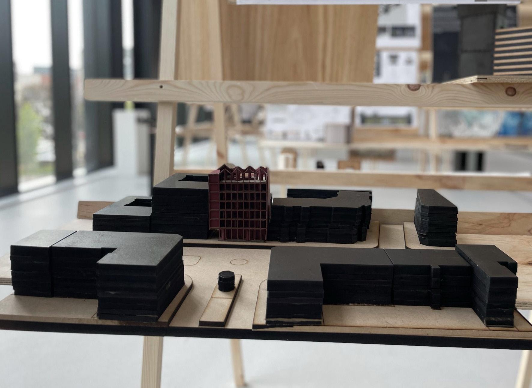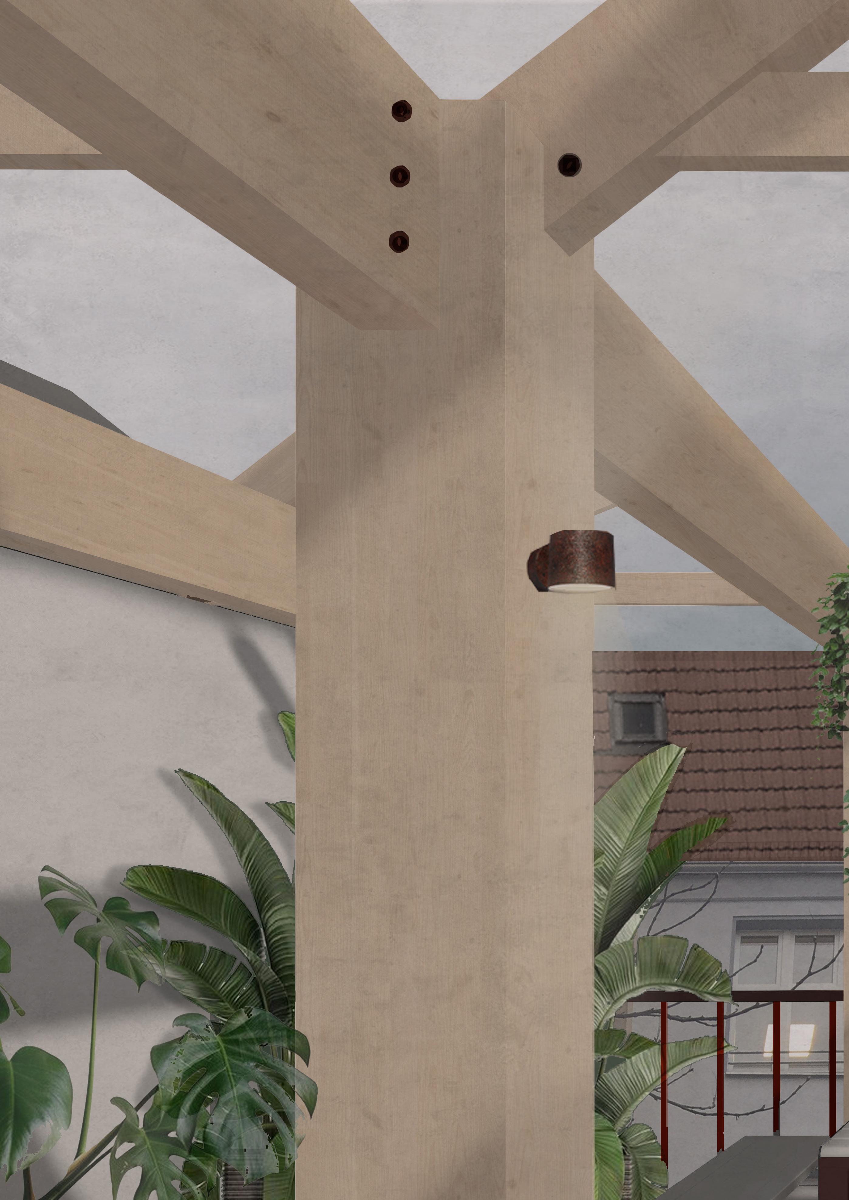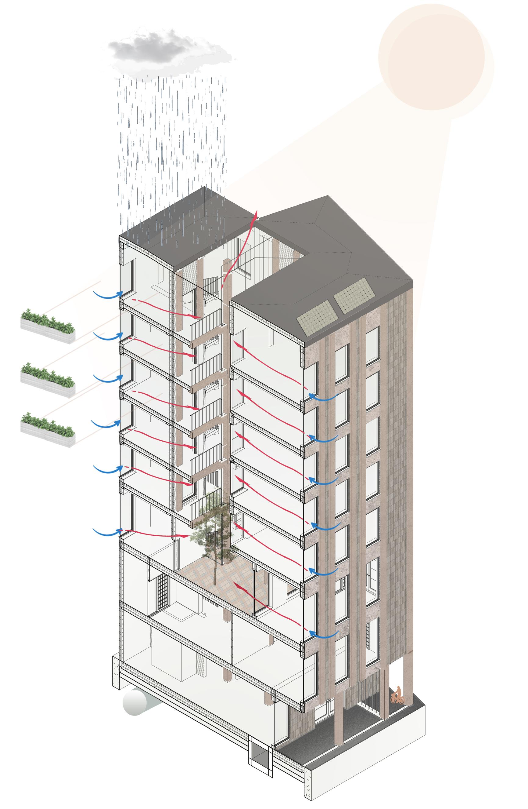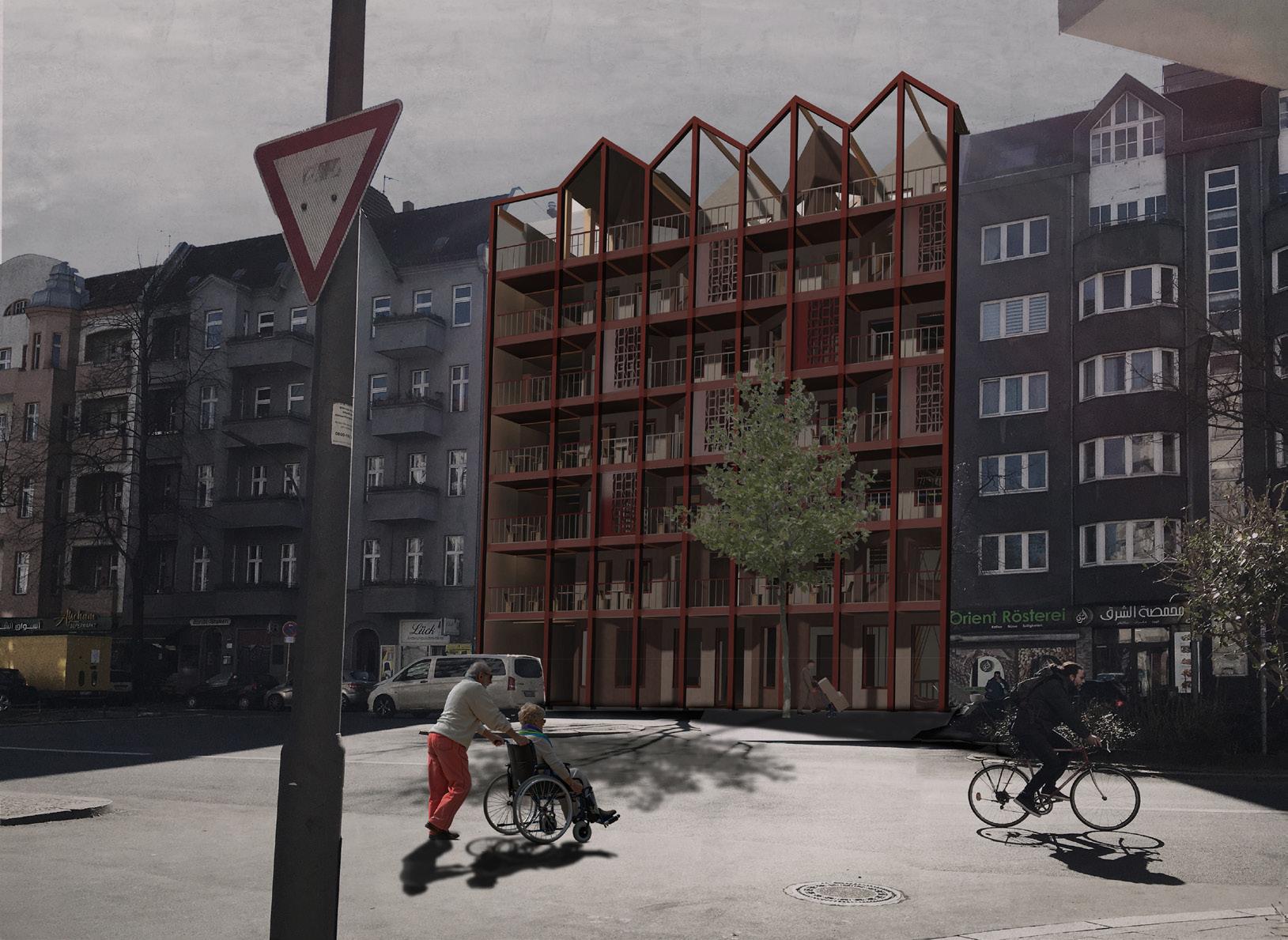 Render : Location within the scheme: Roof top STRAUSSETerrace82, or street 82 is a scheme de signed as the culmination of narratives. Located in the heart of Sonnenallee, a multi-ethnic street in Berlin, it is set to cre ate a space of production amidst spatial, social, cultural and economic tensions and opportunities. The scheme is a civic infra structure for makers, learners and teachers, where each stage of making is represented and carefully distributed within the archi tecture. The targeted users are equally di verse and are encouraged to book sessions in groups of 8. The act of making, equivo cate the act of recollecting, and therefore the individual designs are narratives of ideas, thoughts and impressions of places, experiences, and cultures. The architectural language itself is an amalgamation and re interpretation of the language of surround ing buildings. The new amplifies what already is, impacting the economic, envi ronmental and cultural fabric of the old. The scheme has been designed with an ad equate sustainable strategy, where each stage of the lifespan of the building has been considered. Local production and circular economy were also analysed and synthesised within the composition of the scheme.