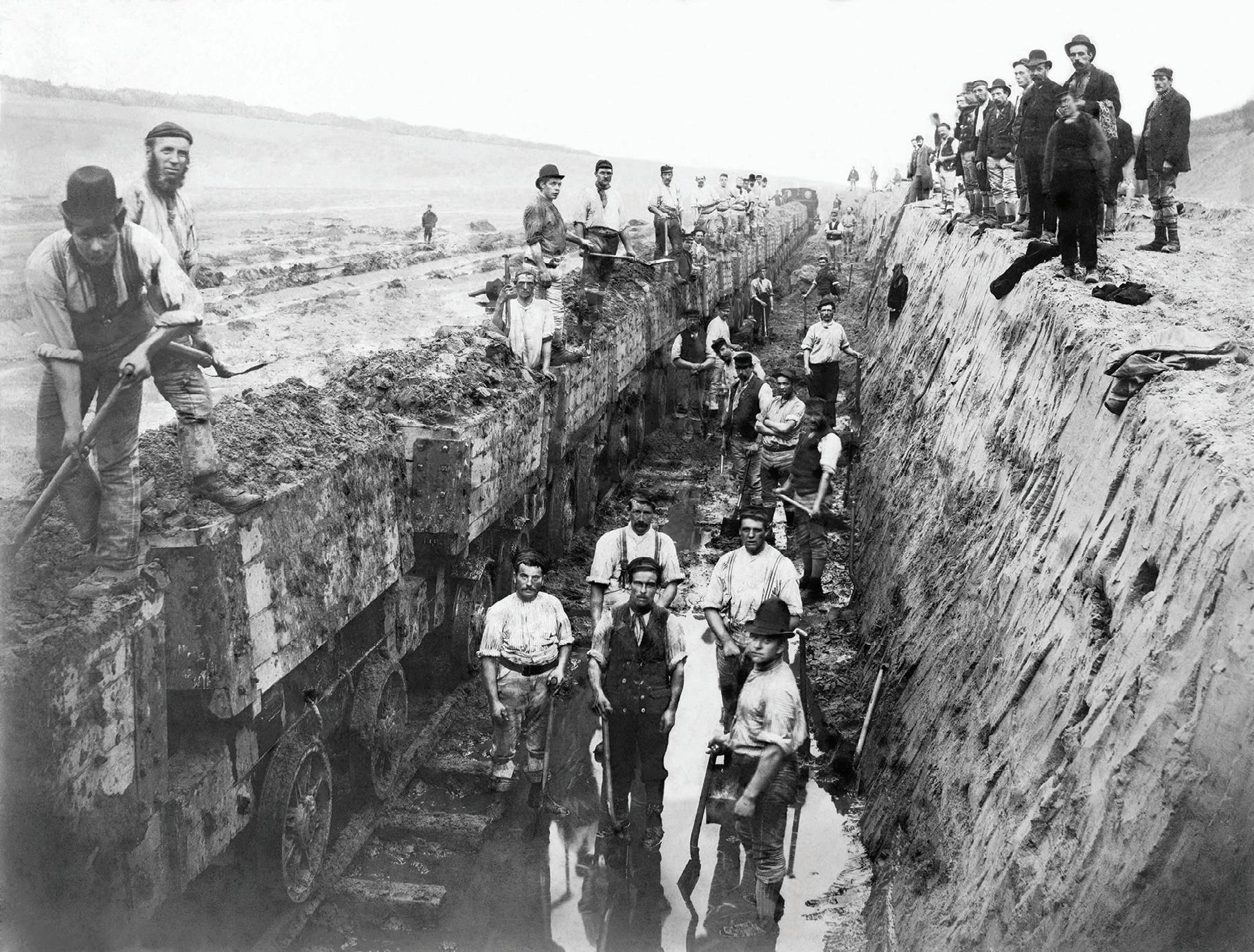 The canal’s construction began in 1887 and employed more than 16,000 men at its peak. Working in gangs with picks, shovels and wooden barrows, they shifted millions of tons of earth. Temporary rail lines, like the one seen here, hauled spoil away in wagons drawn by steam locomotives, and before long the landscape connecting this great city was changed forever.