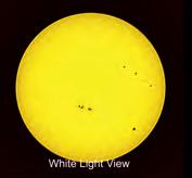 have actually manage to look up at our star and witness what goes on. UNLESS you have access to some specialist equipment, like those who came to the LDAS stand at the recent Baldock Street Fair and looked at the Sun through special solar scopes. There were 2 types available. White light: which lets you see the whole disc with sun spots picked out as black dots against the brightness of the sun and hydrogen alpha (a filter that only lets very specific wavelengths of light through) which lets you look at the bubbling surface, detail of sun spots, and solar prominences squir ng out from the edge