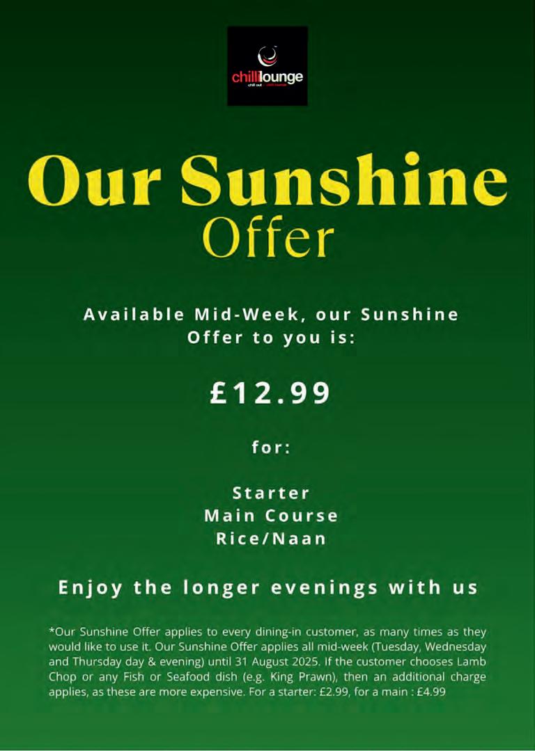 Abbas from the Chilli Lounge is offering a delicious 3course summer special for just £12.99! Either bring in his advert or simply mention the magazine.