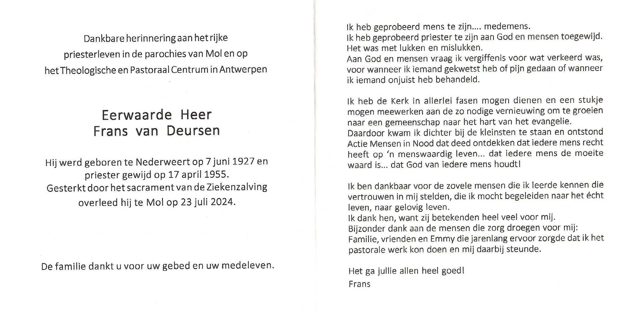 We namen deze zomer afscheid van Pastoor Frans Van Deursen. Frans zette zich tijdens zijn leven in voor mensen in armoede in Mol.