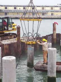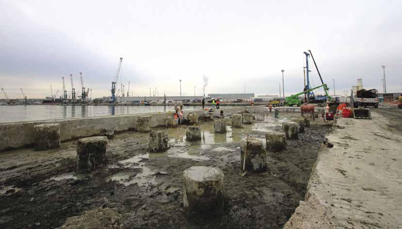 zare le opere. La prima fila di pali, lato fronte mare, è stata eseguita con la tecnica del “segmental casing”, rotoinfissi direttamente con tavola rotary e scavati con asta kelly telescopica e bucket; per le seguenti due file si è scelto invece di utilizzare la vibroinfissione per l’infissione, appunto, del casing, per poi procedere all’asportazione del terreno tra-