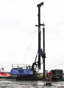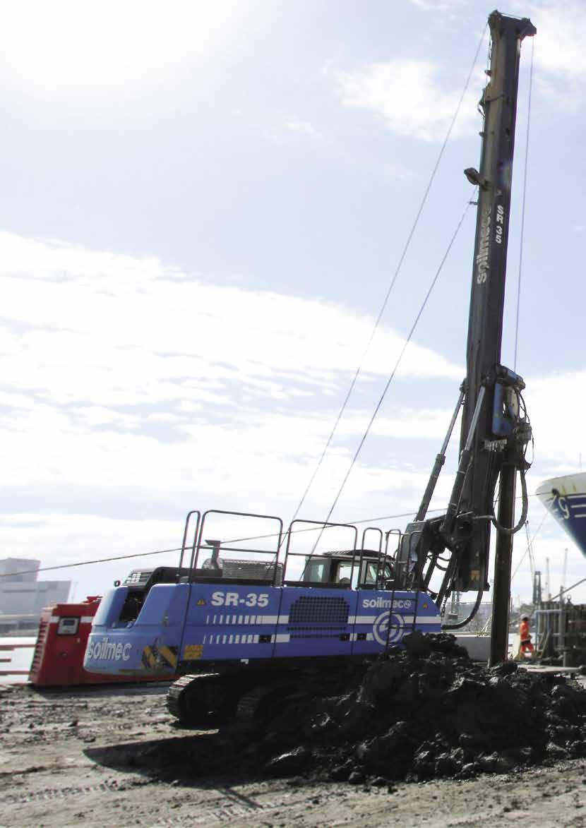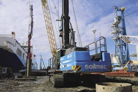 riale di risulta dovrà essere utilizzato per un altro progetto, per sostenere le pareti del palo durante la fase di trivellazione non tubata è stata utilizzata acqua marina al posto della bentonite. In fase di getto, in virtù della presenza di acqua marina, il calcestruzzo è stato additivato da un prodotto chimico anticorrosione salina. La perforatrice Soilmec SR-35 è stata scelta per lavorare in coppia con un vibratore che consente di infiggere ed estrarre la camicia di rivestimento costruita in un unico elemento di 24 m di lunghezza. Questa perforatrice da 35 t è la macchina che più di ogni altra rappresenta Soilmec: dal 1995, anno di produzione del primo R-312 con più di 1.500 unità vendute, è diventata uno standard di riferimento nel segmento di macchine di media taglia nel campo dell’ingegneria del suolo. Date le ristrette dimensioni del cantiere “Terminal Nord” e la necessità di dover cooperare con il vibratore completo di gruppo potenza e gru ausiliaria serviva una macchina agile e poco ingombrante in grado di scavare pali a 36 m mantenendo alti livelli di produzione. La Soilmec SR-35 si caratterizza per un peso operativo di 37 t e un raggio di co-