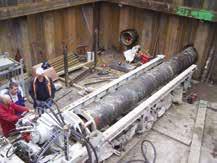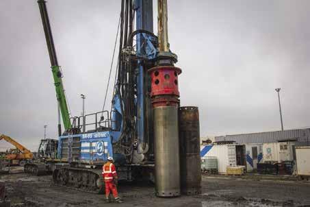 in grado di infiggere casing di 1.000 mm di diametro e con un design robusto in grado di garantire stabilità e sicurezza nell’area circostante. La Soilmec SR-95, modello “High Tech”, è stata scelta in versione con tiro-spinta ad argano WCS e, completa di asta e casing, presenta un peso operativo di 100 t. La torretta è installata su un sottocarro di classe D7 con pattini da 900 mm e bilanciata rispetto al “front weight” da una zavorra da 15 t. La macchina è alimentata da un propulsore diesel Cummins X15 Stage V, in grado di erogare 450 kW, accoppiato a due pompe principali da 444 l/min necessarie per fornire ai grandi attuatori meccanici la potenza necessaria. La testa rotary presenta un valore di coppia massima di 351 kNm e il sistema WCS è stato riprogettato per consentire un alto tasso di produzione. Con una forza di tiro-spinta di 484 kN e una corsa di quasi 19 m, la perforatrice Soilmec è una soluzione ideale per lavorare con camicia di rivestimento, nel caso in esame composta da elementi di 4 e 6 m di lunghezza con giunti a vitoni, che consentono una movimentazione rapida ed efficace. In considerazione del fatto che il mate-