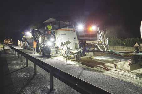 di circa il 50% rispetto ai metodi tradizionali ed è stato possibile convogliare il traffico scorrevole accanto al cantiere mobile. Inoltre, è stato possibile risparmiare sui costi del materiale e del trasporto. Il fulcro dell’intervento di risanamento è stato rappresentato da una W 380 CRI. La macchina è in grado di riciclare la carreggiata danneggiata in una passata. In questo contesto, con il materiale presente sul posto (in sito) viene prodotto un materiale stabilizzato con bitume, in breve BSM, con l’aggiunta di cemento, acqua e bitume schiumato. Questo materiale edile pregiato può essere steso immediatamente sul posto. A Lamia sono state risparmiate circa 24.000 t di nuovo materiale: ciò ha permesso di risparmiare risorse preziose e di ridurre le emissioni di CO2 del cantiere. L’illuminazione a LED sulla W 380 CRi e il nuovo pacchetto luci Plus sulla SUPER 2100-5i hanno offerto ottimali condizioni di luce durante i lavori di risanamento. Un sistema integrato ha fornito un’illuminazione uniforme dell’intera area di lavoro. In tal modo è stato possibile aumentare la sicurezza in cantiere e