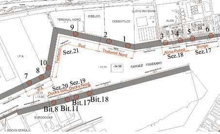 roviari merci e al sistema autostradale, rappresentando così un unicum nel panorama della portualità nazionale. L’area di cantiere è localizzata sui depositi appartenenti al Sintema Emiliano‐Romagnolo superiore - Subsintema di Ravenna. Il terreno che caratterizza l’area di intervento è composto nei primi metri da materiale di riporto antropico seguito da uno strato di cordone litorale composto da sabbie fini con intercalazioni limose, per poi presentarsi prevalentemente limoso, derivante dai depositi deltizi e alluvionali, con strati di sabbia limosa e argilla limosa di spessore anche plurimetrico. La soluzione identificata consiste nella costruzione di una piattaforma in calcestruzzo armato, dietro alla paratia esistente, appoggiata su tre allineamenti di pali di fondazione e ancorata con tiranti a barre. Le opere di fondazioni profonde hanno il compito di trasferire in profondità i carichi superficiali della banchina e contenere la spinta sulla parete verticale, maggiorata dal dragaggio, e sostenerne i terreni in eventuali azioni sismiche per mitigare il rischio liquefazione. I pali da fondazione, gettati in opera e armati, hanno un diametro di 1.000 mm e sono disposti su tre file, distanziati circa 4 m l’uno dall’altro, parallelamente rispetto ai muri spondali esistenti. In totale è prevista la realizzazione di 217 pali, eseguiti fino a una profondità di 36 m,