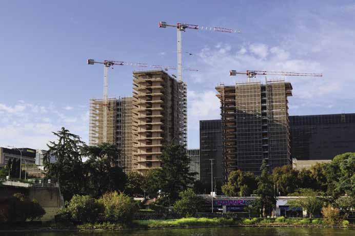 è suggestivo: nel cielo si staglia no tre gru a torre CTT 132-6 - ca ratterizzate da altezze diverse (75, 84 e 96 m) e bracci da 30, 45 e 60 m - ancorate alle strutture tramite appositi collari. Dotate di piatta forma telematica T-Link, che per mette di gestire il parco macchi ne in qualunque momento e da qualsiasi luogo via web, ottimiz zandone l’efficienza e riducendo ne i costi, le gru si distinguono anche per la tecnologia di rota zione “T-Torque” (come tutte le nuove versioni “City Class”), per il design modulare e per l’ascenso re “T-Lift”. Le gru sono state scel te per via della rapidità di mon taggio e smontaggio assicurata, la manutenzione semplificata e per