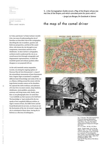 As the early twentieth century mapmaker, Leconte, was doing his ongoing updates of Nouveau Plan de Paris Monumental – a map of the extraordinary monuments of post-Haussmann Paris, Eugene Atget accumulated a completely different kind of knowledge and reality of the city as a flâneur, drifting around the streets with his large-format wooden camera on his shoulders. He captured the (infra-)ordinary and ephemera of le vieux Paris: its street corners, shop windows, inhabitants, street-peddlers, prostitutes, stairways and living rooms until, finally, more than 10,000 photographs later, he stated that ‘I can truthfully say that I possess all of old Paris’. The knowledge or ‘map’ produced by the two speaks of two completely different realities; in Atget’s version of Paris, the Eiffel Tower and the Grand Boulevards do not exist, or at least are not the focal points of the city. In Leconte’s maps, the city is constituted of these alone, leaving the inbetween as a flat tone of nothingness. top: A Leconte. ‘Plan Monumental Paris & Environs Itineraire Metropolitan’, published in the 1928 tourist pocket map of Paris, Nouveau Paris Monumental Itineraire Pratique de L’Etranger Dans Paris 27 x 21 inches : 68.58 x 53.34cm above: Eugène Atget: ‘Cour, Rue de Valence, Paris’, ca. 1920 Automobile and two motorcycles in front of garage in a courtyard, 5e Arrondissement, Paris, France. From the portfolio 20 photographs by Eugène Atget, 1856-1927 by Berenice Abbott, 1956 From the PH Filing Series at the Library of Congress