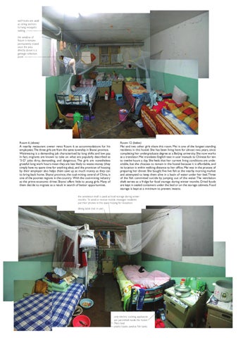 Room 12 (below) Mei and two other girls share this room. Mei is one of the longest standing residents in this hostel. She has been living here for almost two years, since completing her undergraduate degree at a Beijing university. She now works as a translator. Mei translates English text in user manuals to Chinese for ten to twelve hours a day. She feels that her current living conditions are undesirable, but she chooses to remain in the hostel because it is affordable, and its location is within walking distance to her office. Mei was in the process of preparing her dinner. She bought five live fish at the nearby morning market and attempted to keep them alive in a basin of water under her bed. Three of the fish committed suicide by jumping out of the water. The ventilation shaft serves as a fridge for food storage during winter months. Dried foods are kept in sealed containers under the bed or on the storage cabinets. Food storage is kept at a minimum to prevent insects.