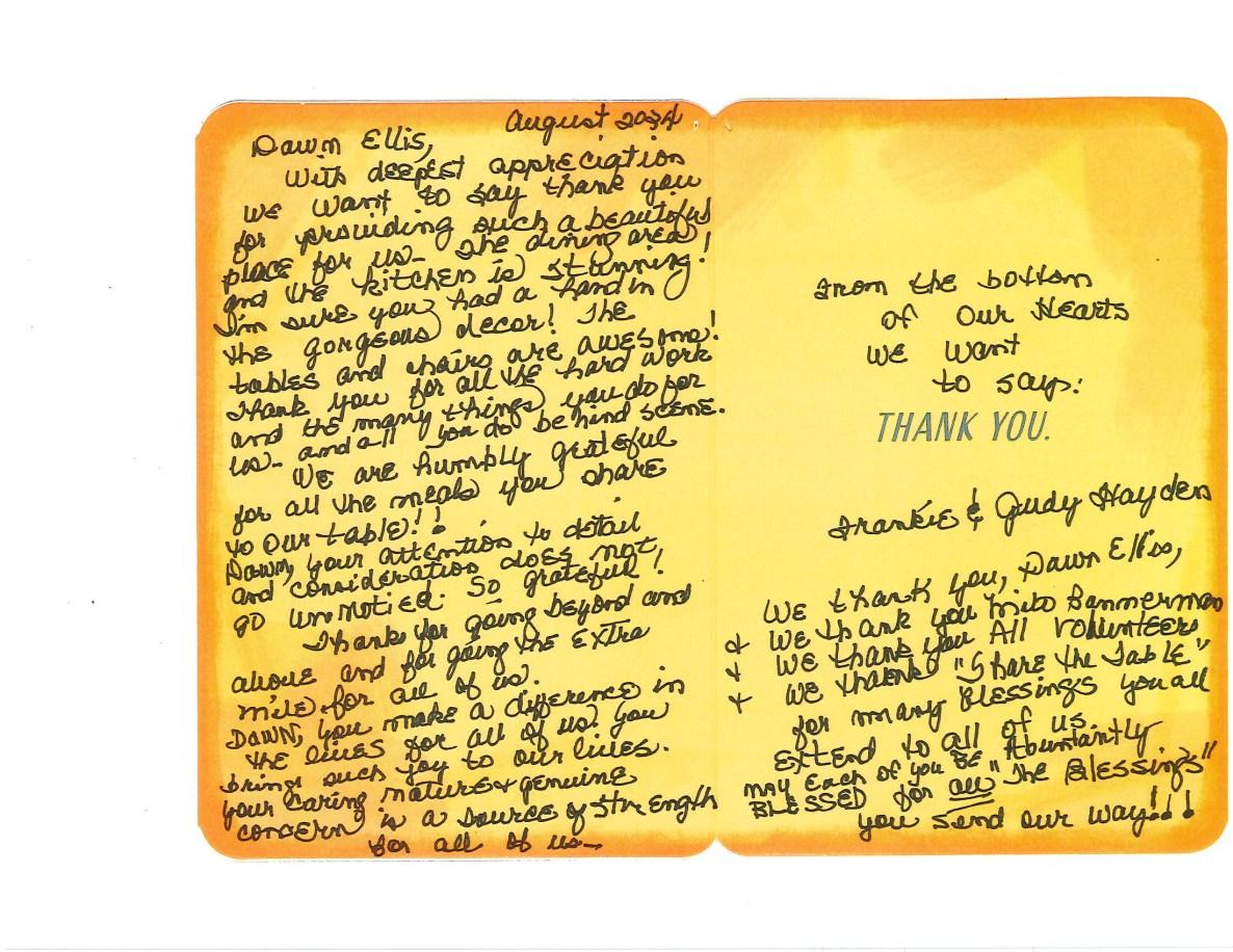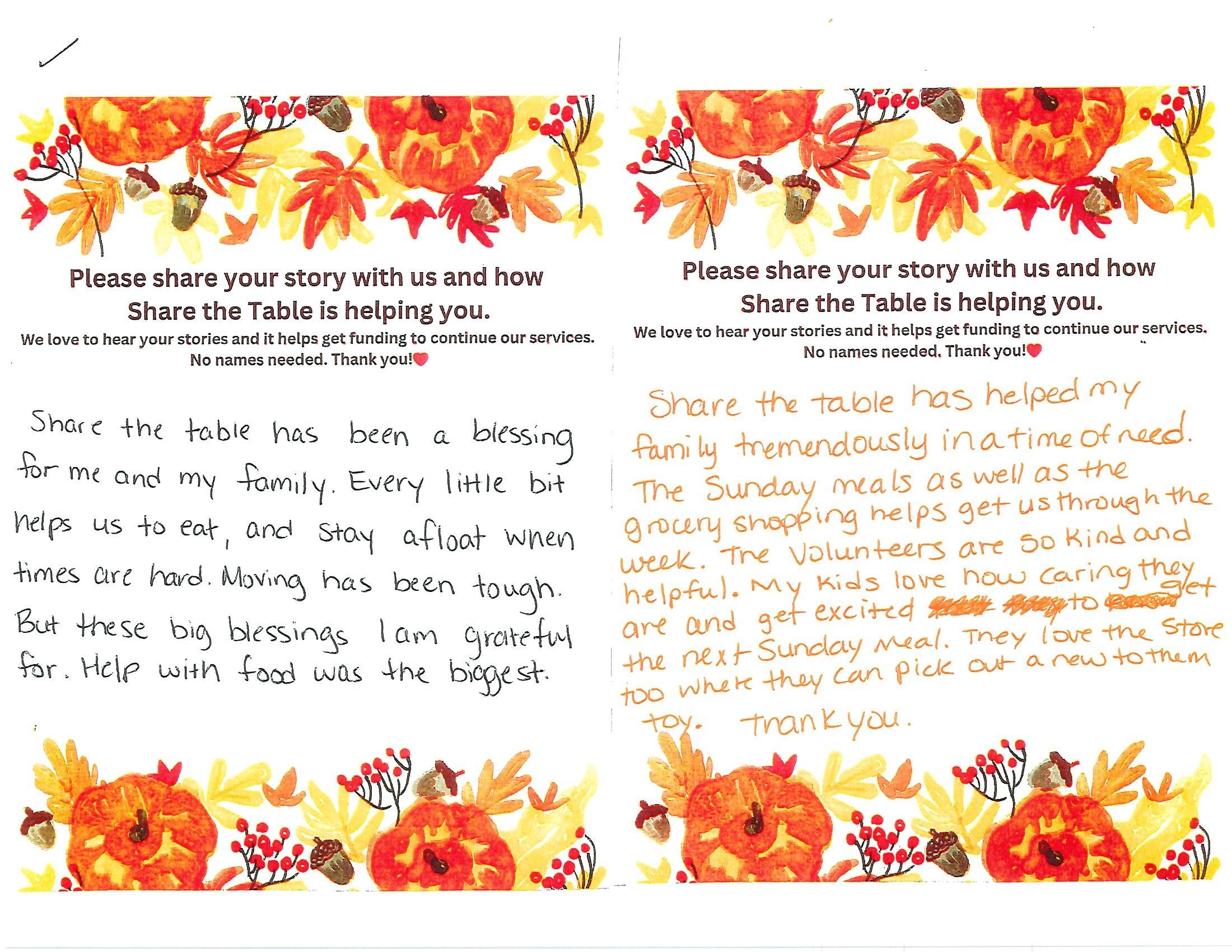 “Share the Table has helped my family tremendously in a time of need. The Sunday meal as well as the grocery shopping helps us get through the week.”