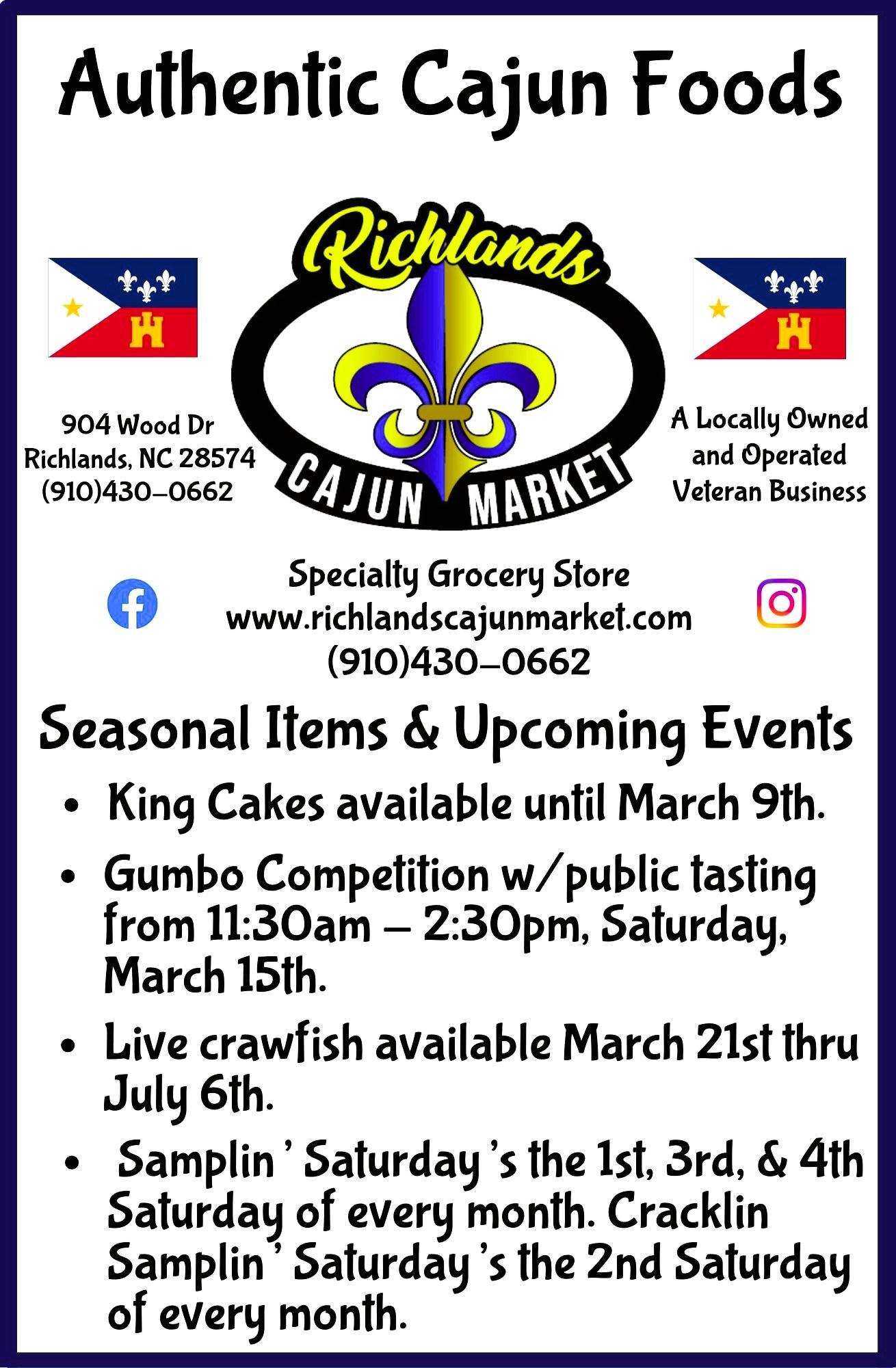 Richlands Cajun Market 904 Wood Drive, Richlands www.richlandscajunmarket. com/ info@richlandscajunmarket. com (910)430-0662