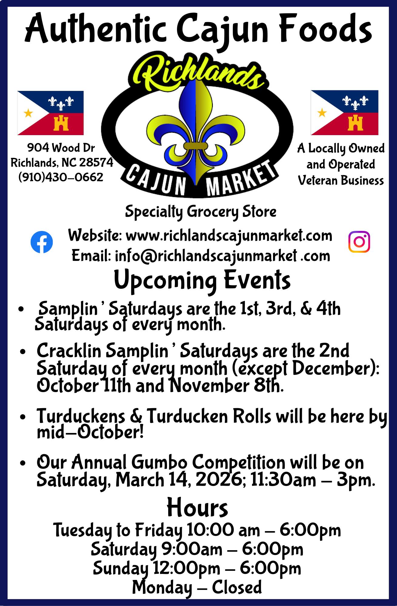 Richlands Chamber of Commerce 8112 Richlands Hwy., PMB 48 Richlands, NC 28574 910-601-5266 or 910-389-6220