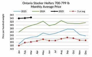 President Trump made tariffs a staple of his presidential run, and has since threatened, delayed, imposed, and lifted tariffs on Canadian products entering the U.S. This has destabilized markets on both sides of the border. With the imposition of tariffs over three days during the first week of March, Ontario feeder cattle prices were down 2% from the last week of February and cull cows were down 8-10%. On April 2nd, President Trump imposed sweeping tariffs against nearly all U.S. trading partners, however, Canada and Mexico were spared additional levies. By April 9th, tariffs against most countries were reduced to 10%, though the trade war with China continued to escalate. Uncertainty will remain high, until all tariff threats are addressed and removed.