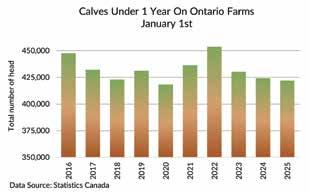 In Ontario, total cattle on January 1, 2025, was fully steady with 2024 at 1.55 million head. The cow herd is showing signs of moving into expansion with beef cows up 1.1% and beef replacement heifers up 6.5%. The Ontario beef cow herd is the second smallest on record going back to 1976 behind 2024. Fed cattle volumes were down 1.4% (-5,400 head) from last year. Fed steers have been largely stable near 260,000 head since 2015. Calves were down 0.5%. The dairy cow herd was 1% larger than 2024 with replacement dairy heifers up 0.5%.