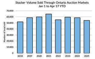 Ontario processing volumes in the first quarter were 132,000 head, steady with 2024 and down 11% from to the five-year average. Processing volumes were supported by fed cattle which were up 1% from last year, while non-fed cattle were down 7%.