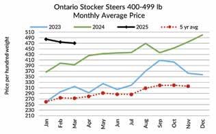 brought significant uncertainty to the market as U.S. tariffs on Canadian products (including live cattle) became a reality for two days. Fed steer prices eased $17/cwt lower from February to March 2025.