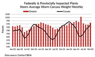 In October, Ontario fed steers were at a $2/cwt premium to Alberta, but a $16/cwt discount to the U.S. Ontario 850-lb feeder steers were at a modest $2/cwt discount to Alberta, but were at a $4/cwt premium to the U.S. Ontario 550-lb steer calves were at a $5/cwt discount to Alberta, but were at a $13/cwt premium to the U.S.