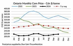 Ontario corn prices have trekked higher over the past number of months, to $217/tonne in October. Corn prices have been below the 10-year average every month this year. The 2024