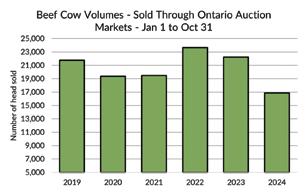 Canadian auction volumes from the first week of September to mid-November were 13% smaller than last year and 8% smaller than the five-year average. Ontario auction volumes were just over 73,000 head, 14% smaller than last year and 13% smaller than