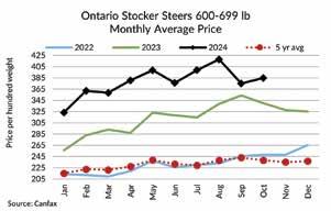 the five-year average. Electronic sales during that time were 36% smaller than last year and 38% below the five-year average and were the smallest on record going back to 2013. Tighter supplies have contributed to an overall bullish tone for feeders this fall. Feeder steers under 600 lb have found significant tailwinds over the last five to eight weeks pointing toward optimism on the fed market in the first half of 2025. Steers 6-800 lb also strengthened over the last several weeks, but were more muted compared to their lighter-weight counterparts. Steers 800 lb and over moved inconsistently sideways.