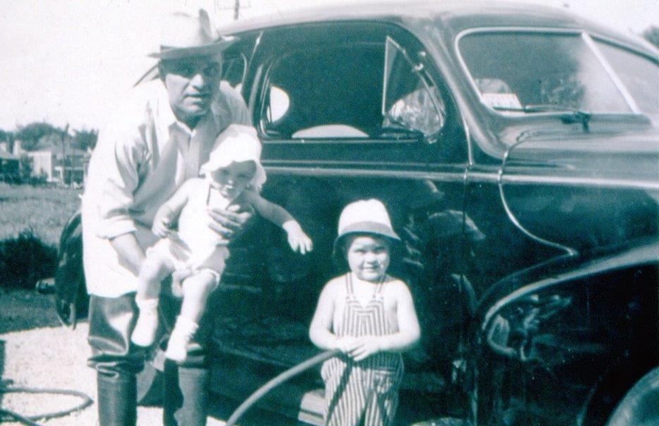 The photo taken by Mom in 1944 shows Dad holding me up at age two and brother John age four holding the hose. With wartime metal shortages, the sticker on the windshield was equivalent to a license plate for that year.