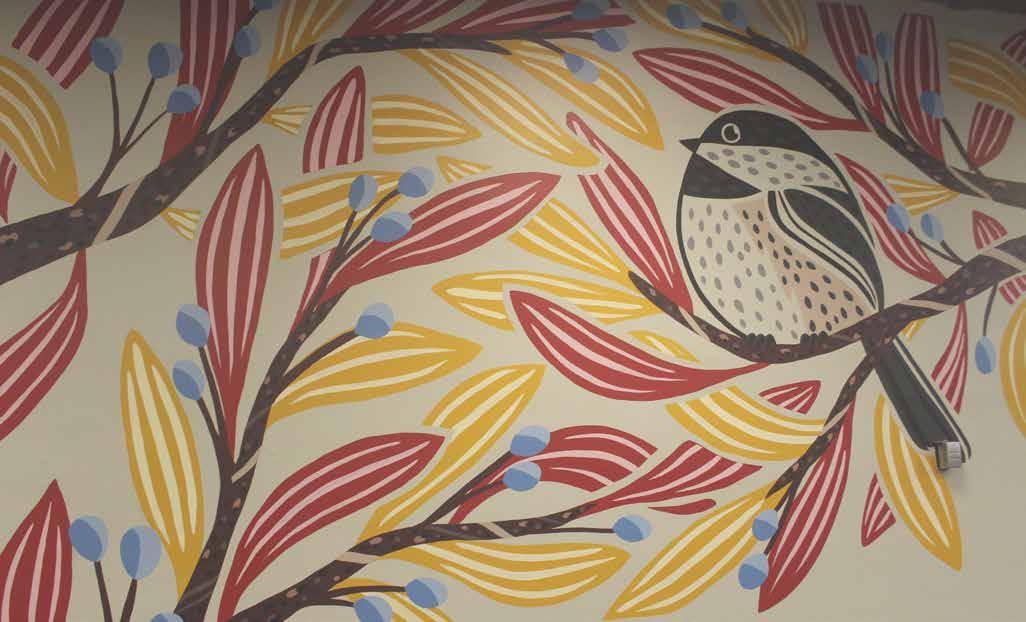 As for the UC mural, Bohn wanted to use colours that were already present in the building while also highlighting the chickadee design.