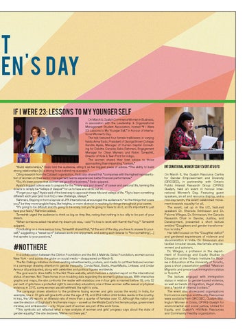 t en's day If I Were 23: Lessons to My Younger Self On March 9, Guelph Commerce Women in Business, in association with the Leadership & Organizational Management Student Association, hosted “If I Were 23: Lessons to My Younger Self,” in honour of International Women’s Day. The talk featured four female trailblazers in varying fields: Anne Sado, President of George Brown College; Sandra Ayala, Manager of Human Capital Consulting for Deloitte Canada; Saba Rehmani, Engagement Manager for Oliver Wyman; and Robin Tameshtit, Director of Kids & Teen Print for Indigo. The women shared their best advice to those ALYSSA OTTEMA/THE ONTARION approaching their impending “careers.” “Build relationships,” Sado told the audience, citing it as her biggest piece of advice. “The ability to build strong relationships [is] a driving force behind my success.” Citing research from the Catalyst organization, Sado also shared that “companies with the highest representation of women on their senior management teams experienced better financial performance.” “So, it’s been proven that women are good for business,” Sado quipped. Ayala’s biggest advice was to prepare for the “many ups and downs” of career and personal life, terming the downs to simply be “valleys of despair” for us to face and climb out of. “Forget your ego,” Ayala said of the best way to approach these hills and valleys of life. “Try to learn something different each year [and look for] a new challenge, always.” Rehmani, Skyping in from a layover at JFK International, encouraged the audience to “do the things that scare you,” be they more tangible fears, like heights, or more abstract in reaching for things throughout your career. “It’s going to be difficult and it’s going to be scary, but you’re going to have to do it, so it’s important to just face your fears,” Rehmani added. Tameshtit urged the audience to think as big as they like, noting that nothing is too silly to be part of your dream. “When someone asked me what my dream job was, I said ‘I’d love to work with Kermit the Frog,’” Tameshtit quipped. Concluding on a more serious tone, Tameshtit shared that, “at the end of the day, you have to answer to yourself,” suggesting a “sweet spot” between work and enjoyment, and asking each listener to “find something […] that speaks to your passions.”