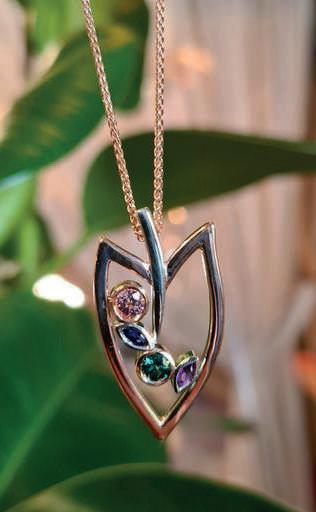 Roxanne wanted a pendant that would celebrate life after ‘completing her little family’ with the birth of her son. We created a design that held a beautiful array of gemstones, each representing the birthstone of a family member, all encompassed in the hand-made, golden leaf of a tropical plant as a nod to her favourite pastime.