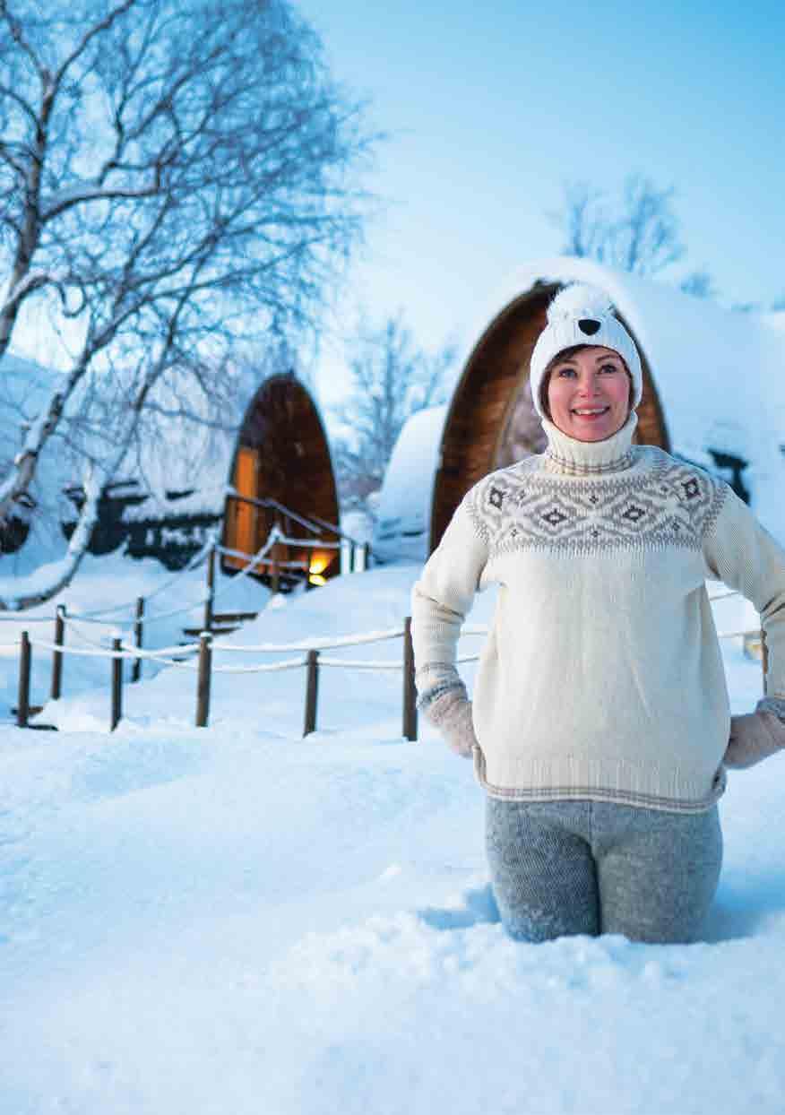 the ride, but make no mistake—it’s still COLD. About halfway through, the driver stopped in a sheltered forest area for some hot, spiced lingonberry tea, which was available in several places around the hotel and quickly became an obsession of mine. It reminded me of a non-alcoholic version of holiday Wassail. After the brief stop, we finished our dog sledding adventure with an exhilarating dash across a frozen lake and returned to the hotel to relax before our orientation dinner.