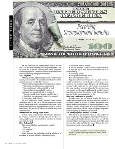 • Your Social Security number • Your last employer’s name, address, and phone number • Your last day of work and the reason that you’re no longer working • Your salary history • Your proof-of-citizenship status How are benefits calculated? Regardless of which state you live in, you’ll receive a weekly unemployment benefit based on how long you were employed and your prior wages. The state will calculate your average weekly wage, and you will receive a percentage of that wage based on your state’s formula. You can figure out your average weekly wage by adding up 12 months’ worth of pay stubs and dividing that number by 52. If you were salaried, just divide your annual salary by 52. How long can I receive benefits? In most states, you can receive benefits for up to 26 weeks. However, federal laws and some state laws provide for additional benefits to be paid to workers who exhaust their regular benefits during periods of high unemployment. These additional benefits may generally be paid up to 14 weeks (20 weeks in some states) and are funded partly by state governments and partly by the federal government. Are unemployment benefits taxable? The answer to this question comes as a big surprise to many people. Yes, the unemployment compensation you receive is generally taxable. In some states, you can ask that taxes be withheld from your unemployment check. This could save you from a big tax bill at the end of the year. For more information, consult your tax advisor. At Austin Asset, we are Fee-Only Financial Advisors. We seek to bring clarity and purpose to wealth through authentic and enduring relationships. For Life.