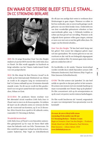 En waar de sterre bleef stille staan woensdag 22 december om 20 uur CC Stroming Berlare - Tickets: 3 euro Regie en Scenario: Gust Van den Berghe – Producer: Minds MeetCast: Jelle Palmaerts, Paul Mertens, Peter Janssens – release datum: 2010 www.littlebabyjesus.eu tekst: Leen De Greve