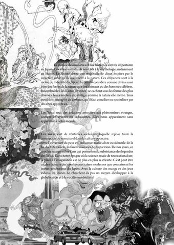 La culture des monstres et des fantômes est très importante au Japon. Ces êtres surnaturels sont liés à la mythologie, notamment au Shinto. Le Shinto abrite une multitude de dieux inspirés par le caractère sacré qu’ils accordent à la nature. Ces croyances sont à la racine de l’identité du Japon. Le Shinto considère comme divins aussi bien des forces de la nature que des animaux ou des hommes célèbres. Innombrables, les Kami (divinités) se cachent sous les formes les plus diverses, leur caractère est ambigu, comme la nature elle même. Tous possèdent un esprit de violence, qu’il faut concilier ou neutraliser par des rites appropriés. Les Yokai sont des créatures associées aux phénomènes étranges, souvent effrayantes ou séduisantes. Elles nous apparaissent sans appartenir à notre monde. Les Yokai sont de véritables socles sur laquelle repose toute la conception du surnaturel dans la culture japonaise. Avec l’ouverture du pays et l’influence matérialiste occidentale de la fin du XIX e siècle, ils furent menacés de disparition. De nos jours, ce sont les mangas et les films qui permettent la subsistance des légendes des Yokai. Dans notre époque où la science essaie de tout rationaliser, la place à l’imagination est de plus en plus restreinte. C’est peut être un des facteurs des nombreuses crises modernes que connaissent les jeunes générations du Japon. Avec la culture des manga et des jeux vidéos, les jeunes ne cherchent-ils pas un moyen d’échapper à la globalisation et à la société matérialiste?