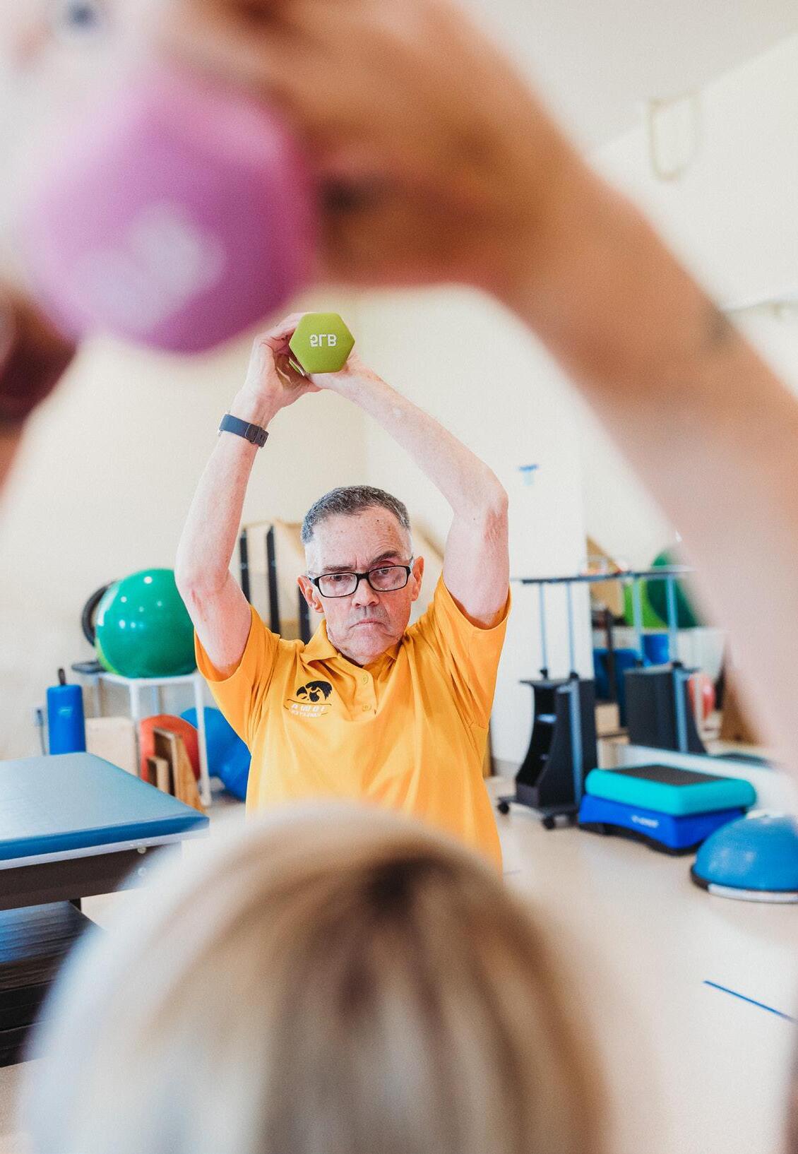 Mark Wilson works on coordination and strength at On With Life’s outpatient clinic in Coralville with physical therapist, Paula Duve, and occupational therapist, Kate Thompson.